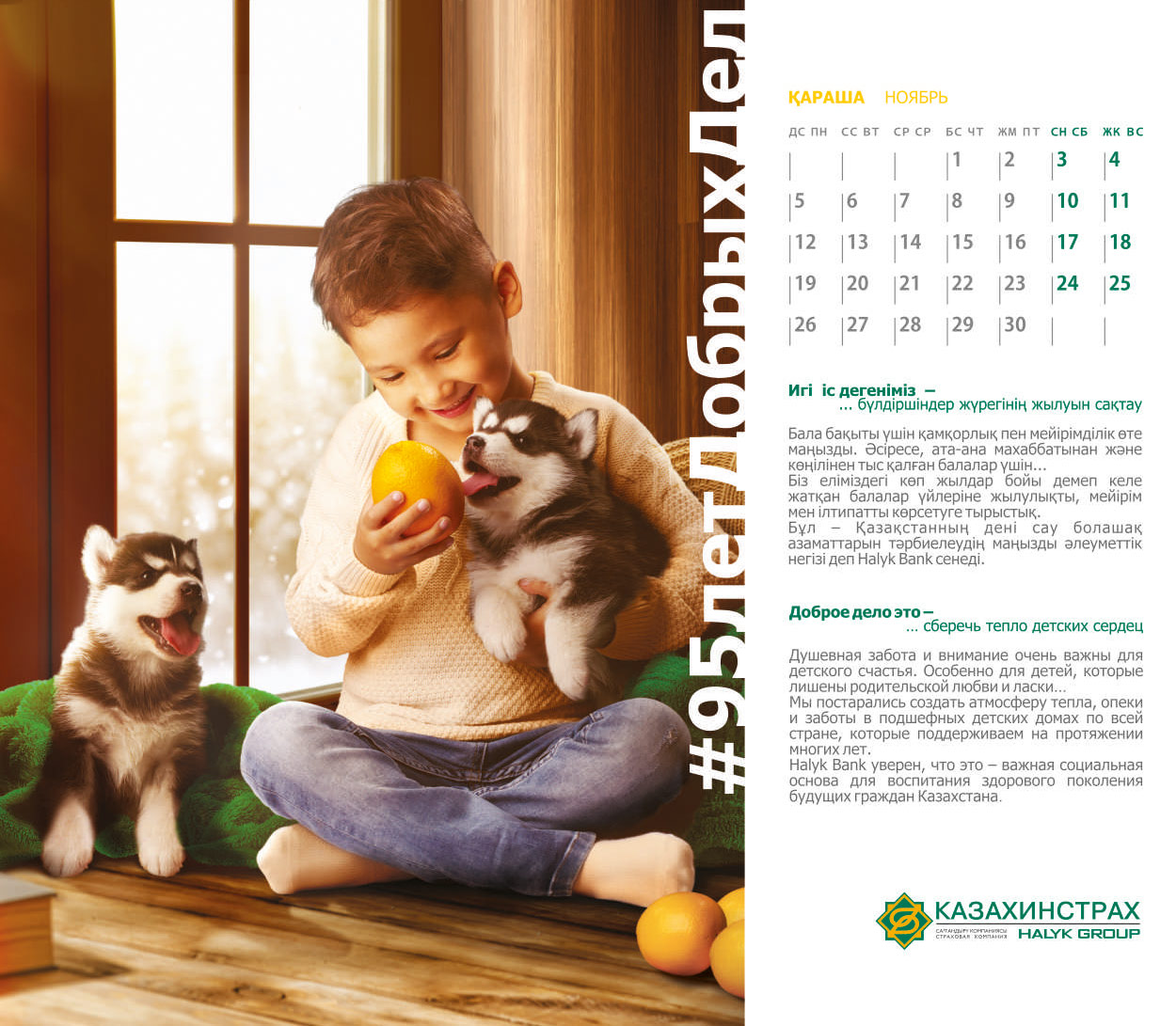 Не важно сколько вам лет и кому вы помогли, каждый добрый поступок – это БОЛЬШОЕ ДЕЛО. Каждый месяц календаря – это рассказ о добрых делах Банка и призыв каждому казахстанцу сделать свое доброе дело.
