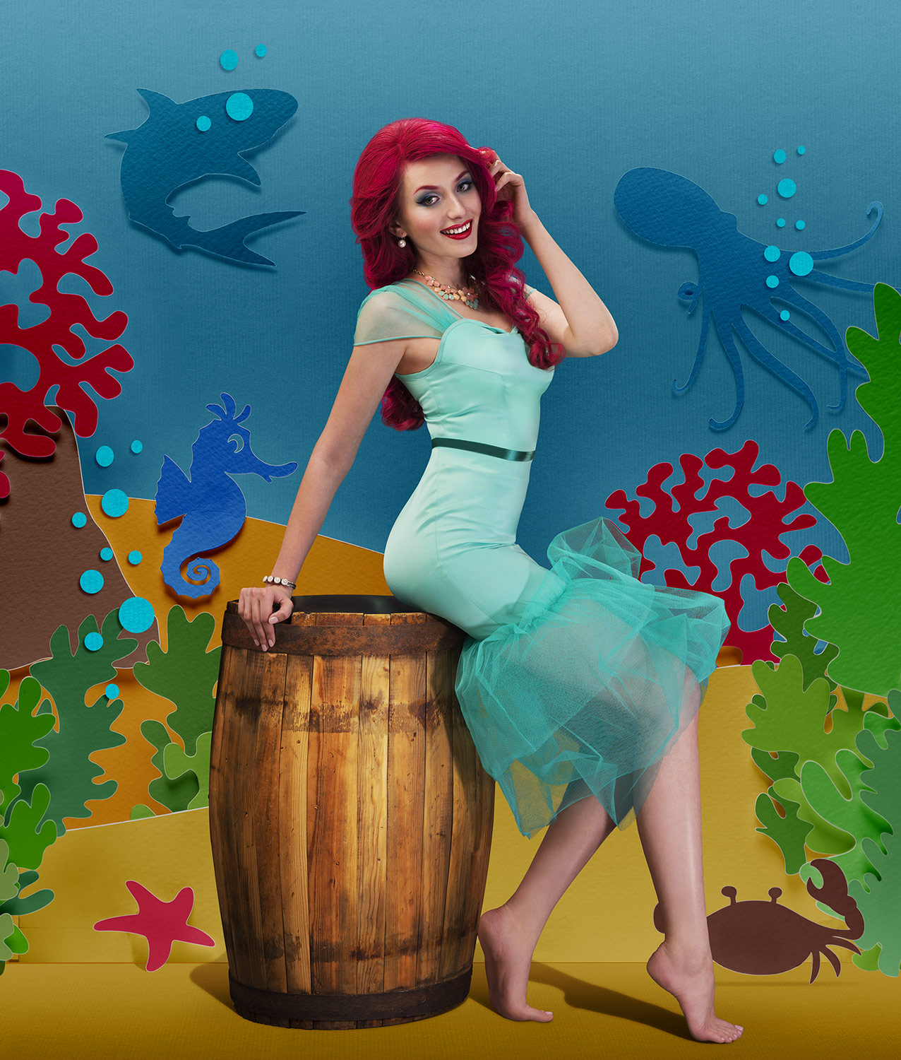 На ретушь у меня ушло несколько недель. Как часто бывает на этом этапе, в процессе возникло много нюансов. Например, у модели Пеппи в реальности во время съемки стояли брекеты. Это был сознательный выбор на кастинге, так как добавляло деталей к образу. Но, на посте передумали, и брекеты пришлось убирать, перерисовывая зубы. У Русалочки планировалась татуировка, но от нее тоже пришлось отказаться. Этап ретуши был объемным, но достаточно рутинным – тут с кожей поработать, там прибрать у костюмов, кое-где удлинить/укоротить, где-то подкрасить. Были моменты, когда приходилось делать серьезные изменения во внешности, но по возможности я старался сохранить «натуральность» моделей.