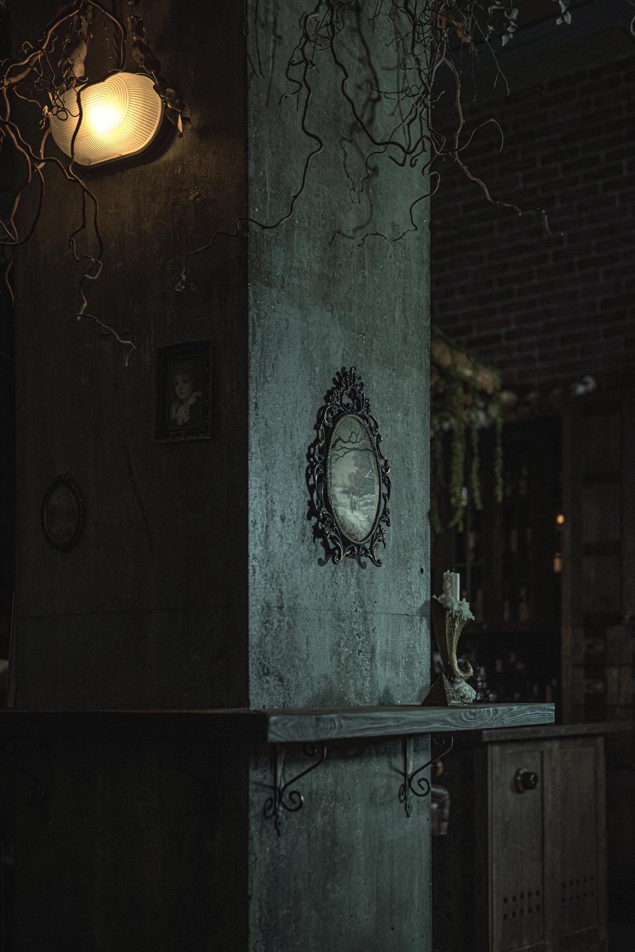 Индустриальные бра разместили на колонах, но они скорее для декоративного освещения и подсветки для различных винтажных бронзовых рам.