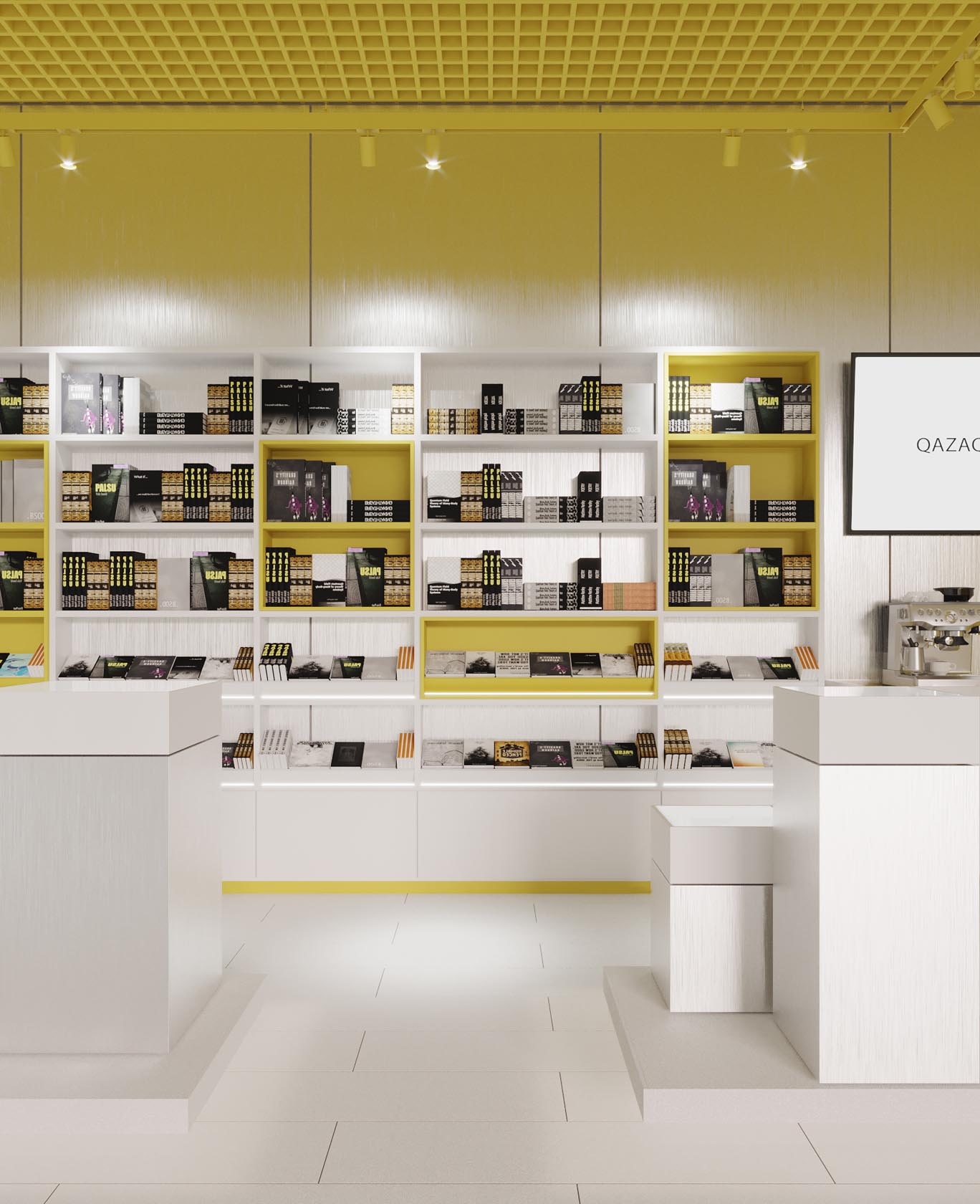 Множество стеллажей сделаны не в монохроме, а с вкраплениями желтого в разных вариациях. Это лишь подчеркивает разнообразие представленных книг: от вечной классики, изданной на казахском языке, до только что вышедших новинок местного издательства. Подсветка на стеллажах и в кофейной зоне выглядит как элемент дизайна, продолжая игру света и добавляя объем.