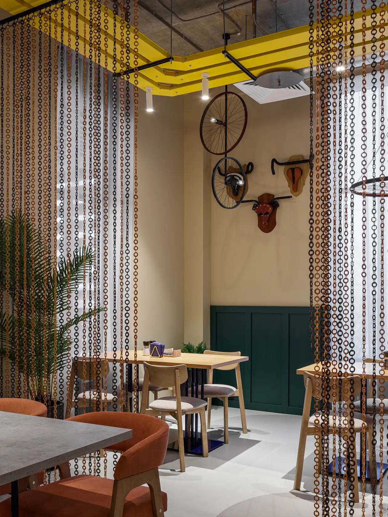 Дальняя часть ресторана — это зона фрирайда, где свобода движения становится главной темой. Здесь гостей встречает вывеска со словом «БАЗА», граффити с изображением велосипедиста, покоряющего горы, и занавес из металлических колец, напоминающих велосипедные цепи, за которым скрывается VIP-комната. В этой комнате висят словно «охотничьи трофеи» — арт-объекты, созданные из деталей велосипедов. Над столами разместились круглые люстры из велосипедных колес, что добавляет интерьеру привлекающих внимание деталей.