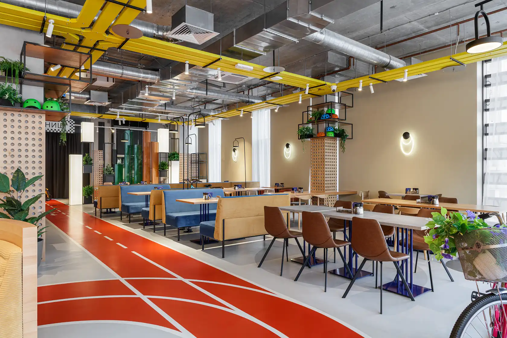 Особое внимание привлекает красная велодорожка. Это не просто декоративный элемент, а функциональная деталь интерьера. Она объединяет ключевые зоны ресторана: ведет гостей от входа к посадочным местам, бару, верандам и обратно к выходу и санузлам, помогая ориентироваться в пространстве.