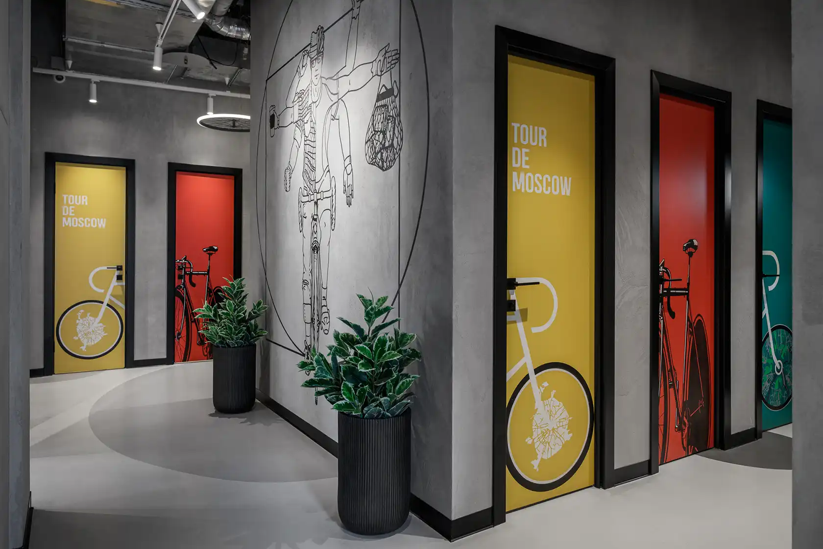 В центральной части помещения гостя ждет овальная дорожка велотрека, над которой парит световая инсталляция, напоминающая следы огней на длинной выдержке — эффект завораживает, будто здесь только что пронеслись велосипедисты на полной скорости. Спинки диванов, выполненные из наборной доски, перекликаются с материалом настоящего гоночного трека и своими изгибами добавляют пространству динамики. Вдоль стены расположены две тематические зоны: «ремонтный цех» и бар в виде трибуны жюри. На стене — графика-инструкция «Как собрать велосипед» и перегородка из велосипедных запчастей. Эта зона — настоящий эпицентр скорости, энергии и спортивного азарта